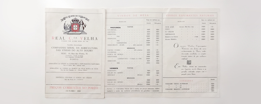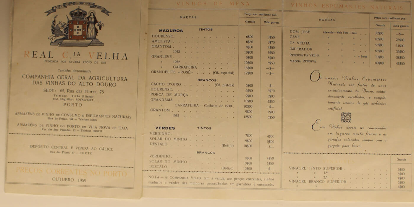A lista de preços praticados pela Companhia em 1959, é um dos vários objetos que apresentam a evolução identitária da marca ao longo dos tempos.  As listas de preços em conjunto com os cheques, matrizes de impressão e garrafas históricas, são alguns dos objetos que estão expostos no sétimo núcleo da exposição permanente. Os quais permitem contextualizar a evolução comercial da Real Companhia Velha em conjunto com o papel determinante que esta empresa desempenhou na região e na cidade do Porto.