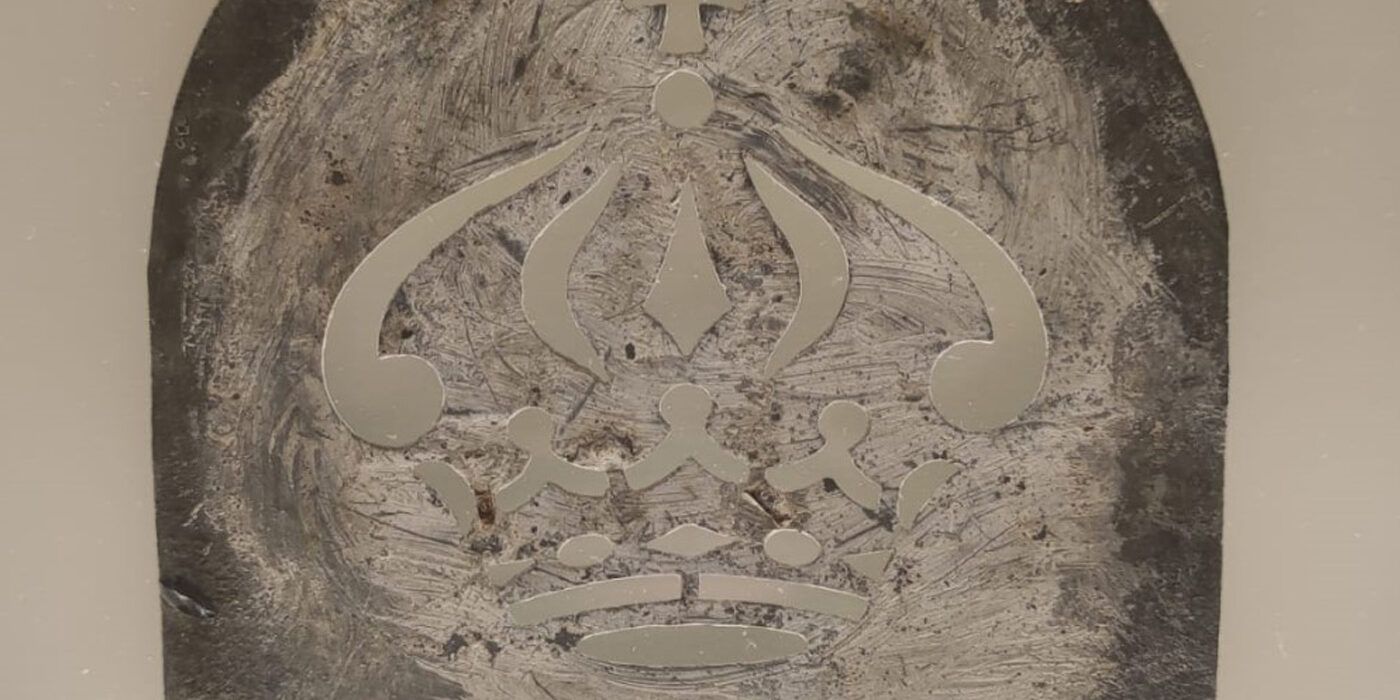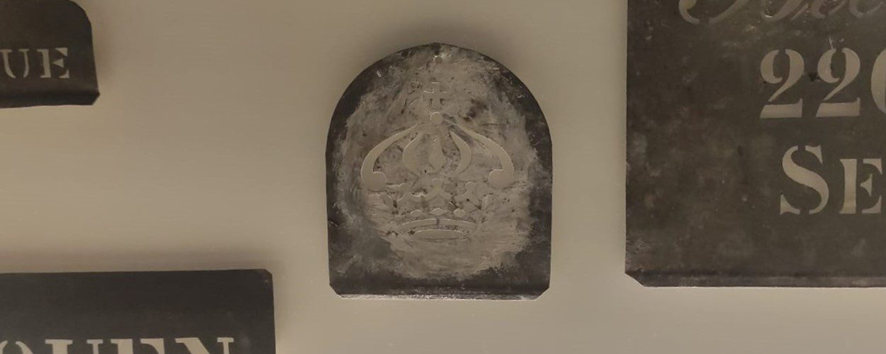 Como já mencionamos anteriormente, as máscaras de stencil eram utilizadas na marcação de caixas de exportação, assim como na marcação de pipas onde repousava o vinho produzido no Douro. Estes são elementos relevantes para a perceção da evolução gráfica da marca, assim como da sua expansão comercial pelo Mundo. Neste caso, a máscara de stencil escolhida apresenta a imagem de uma coroa, um dos principais símbolos da Real Companhia Velha, enquanto Ex-majestática Companhia.